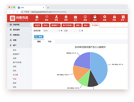 多样报表类型,有柱形图、条形图、饼图、漏斗、曲线等,筛选条件众多,设置相应条件,依据系统模块统计规则,报表随调随变。