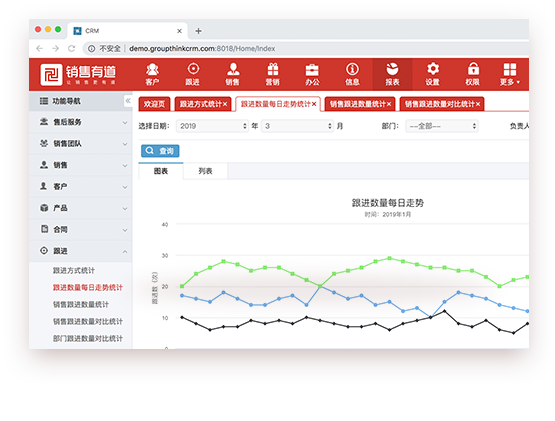 实时查看指定时间跟进数量分析,解决客户数量大、无法跟进的情况,从而使销售员根据自己客户状态展开有效跟进,使销售人员从繁复客户筛选工作中解脱出来,大大提高跟进效率。