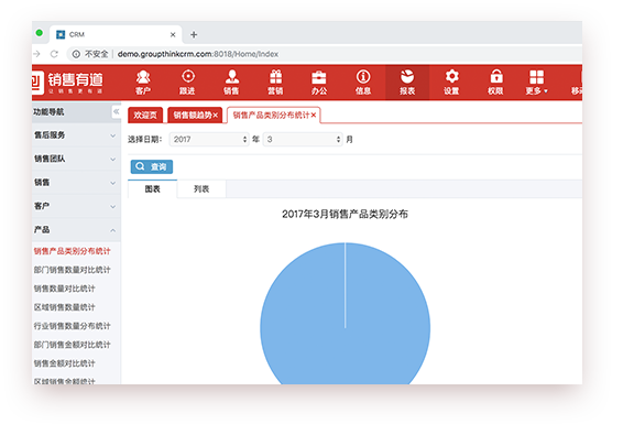 各种报表类型,柱形图、条形图、饼图、漏斗、曲线等,筛选条件众多,报表随调随变,数据全面,可以统计系统所有模块,设置相应条件即可。
